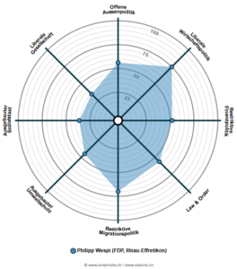 Anmerkung: Als bisheriger Stadtrat und Teil des Stadtratsteams (Stichwort Kollegialitätsprinzip) waren gewisse Fragen für mich nur schwierig und/oder mit Vorsicht zu beantworten, was sich in der Smartspider-Auswertung niederschlug. z.B. ist die Ausprägung in “Liberale Gesellschaft” wesentlich zu tief ausgefallen; Die Ausprägung deckt sich nicht mit meinen Werten und meiner Einstellung als gesellschaftlich offene Person.